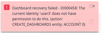 ダッシュボードを復旧するには、CREATE_DASHBOARD 権限を使用する必要があります。この権限を使用せずに [Recover] オプションを実行すると、次のメッセージが表示されます。